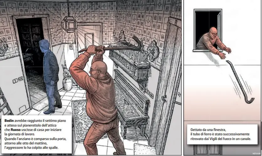 L’agguato si è consumato sull’uscio dell’appartamento numero 25 al settimo piano, raggiunto da Bedin qualche minuto dopo le 7. 22 quando una telecamera di sorveglianza fuori dal condominio lo riprende mentre si avvicina all’androne impugnando un tubo di ferro lungo 71 centimetri. Salito al piano dell’attico, ha atteso Ruoso uscire e, nel momento in cui la vittima stava per chiudere la porta d’ingresso, l’ha colpito da dietro facendolo cadere in avanti e urtare il volto sullo spigolo di un tavolino di vetro. Poi, una volta disteso a terra, l’ha colpito più volte al capo con un’azione feroce, una vera e propria mattanza.