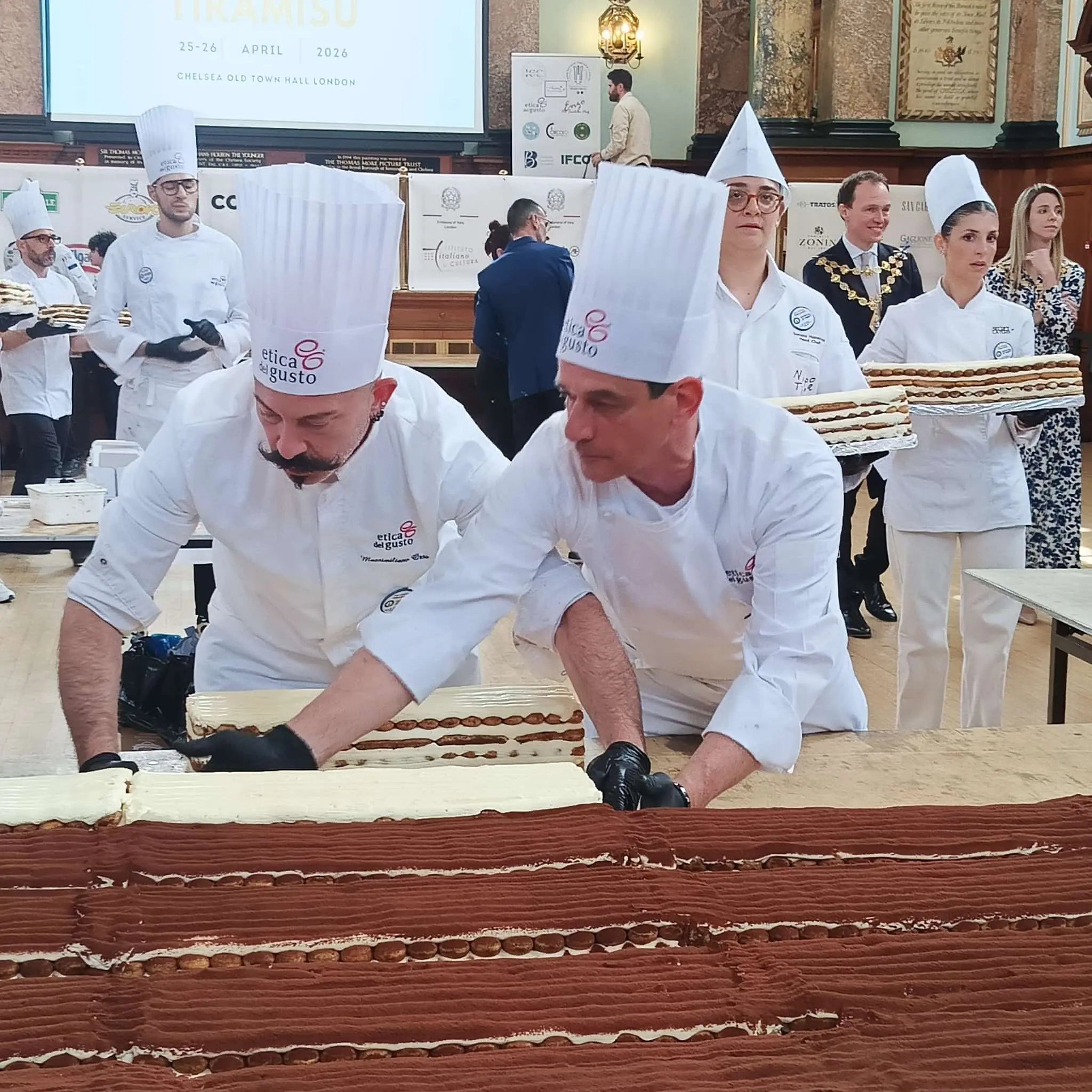 L’impresa che vale il Guinness World Record per il team di professionisti regionali messo insieme dal gemonese Mirko Ricci è stata realizzata domenica 26 aprile alla Chelsea Old Town Hall: sono serviti 800 litri di caffè, 150mila savoiardi, 500 chili di uova, 150 chili di panna e mascarpone