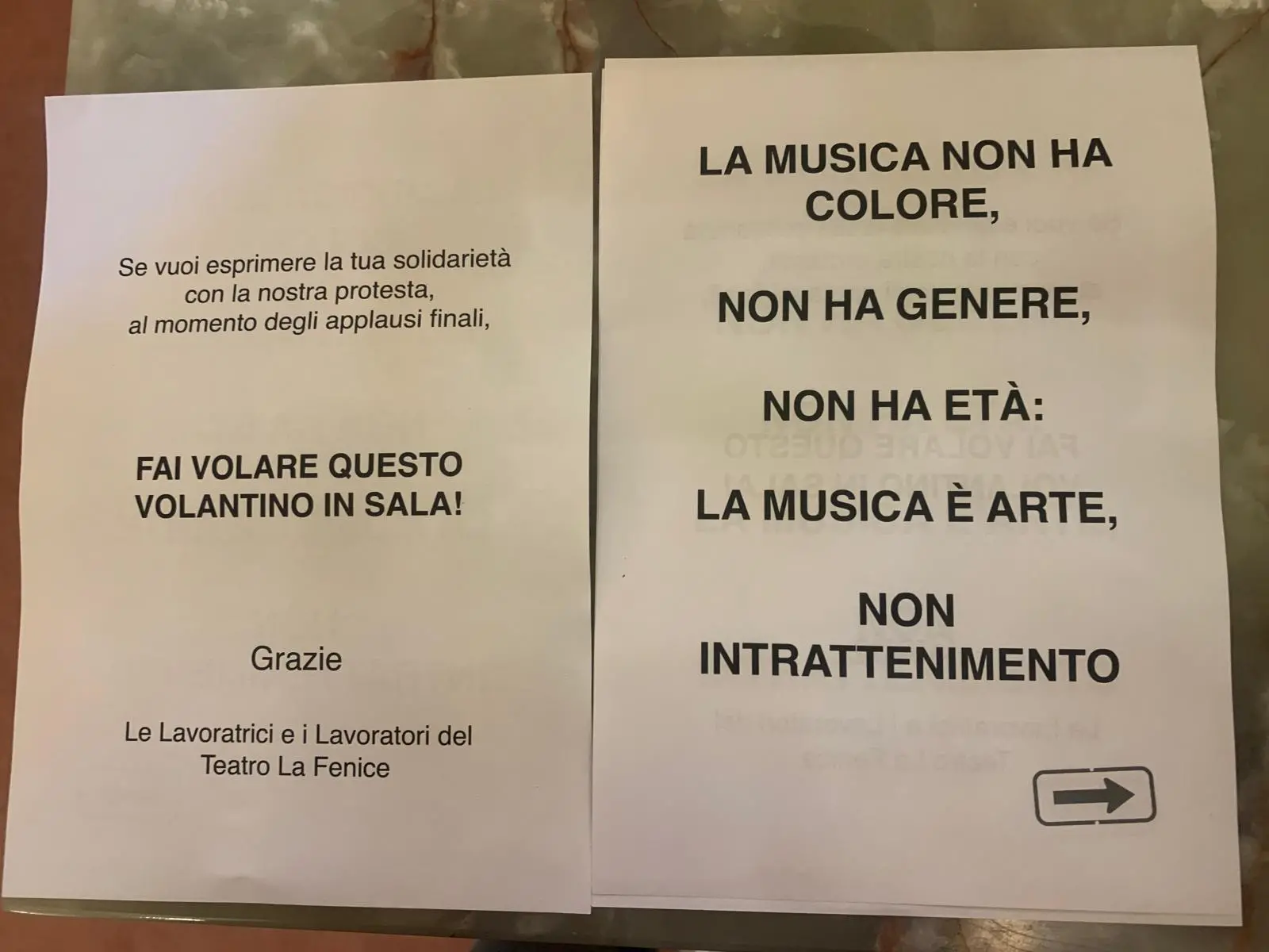 Campo San Fantin si riempie a poco a poco, mentre il teatro La Fenice brilla sotto un cielo che promette pioggia. Un’ora prima che il concerto di Mahler inizi, gli orchestrali si danno appuntamento per fare volantinaggio fuori dal teatro. “La musica non ha colore, non ha genere, non ha età. La musica è arte, non intrattenimento”, così recitano i fogli consegnati al pubblico, ma anche a chi, per caso, si trovava a passare dal campo.