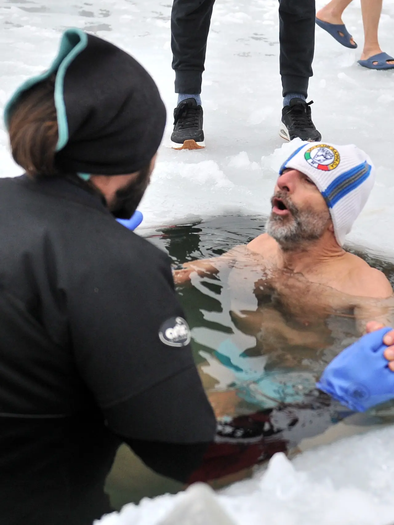 Uno alla volta i curiosi accreditati per l’immersione, oltre una trentina, muniti di certificato medico che ne attestava lo stato di conformità fisica, muovendo scalzi dalla riva alla lingua d’acqua preparata ad hoc, si sono lentamente calati nell’abbraccio invernale con l’acqua. La colorazione dei corpi, che dal loro consueto regime di circolo sanguigno hanno dovuto contrastare i 34 gradi di sbalzo termico, è passata dal pallore estremo a varie tonalità bluastre, fino a raggiungere il rosso rubino della vasocostrizione più estrema.