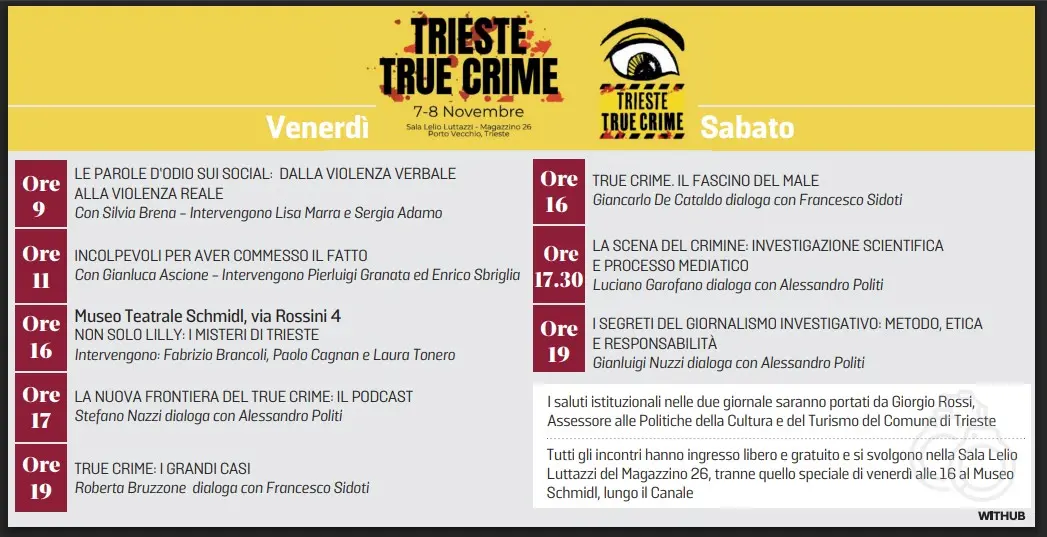 Sabato la riflessione prosegue con altri nomi di spicco: Giancarlo De Cataldo, Luciano Garofano e Gianluigi Nuzzi. Si parlerà di fascino del male, di scena del crimine, di metodo, etica e responsabilità nel giornalismo investigativo. L’evento prevede anche il Premio Trieste True Crime: un riconoscimento a chi racconta senza deformare.