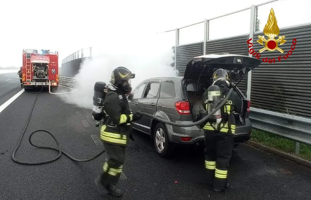 Fuoco e fumo sull’autostrada A4: auto avvolta dalle fiamme