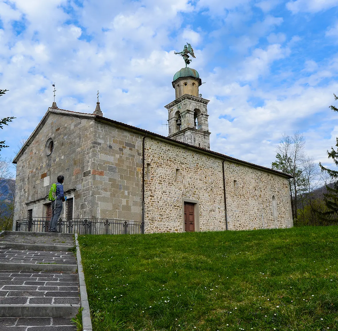 Suonano le campane sul Colle di San Martino. L’angelo anemometro sul campanile della pieve cinquecentesca punta a ovest. La cisterna in cocciopesto del V secolo indica che quassù si viveva fin dall’epoca romana. Era in una posizione importante, Artegna, vi confluivano tre antiche vie: da Concordia, Aquileia e Cividale. Seguiremo quest’ultima.
