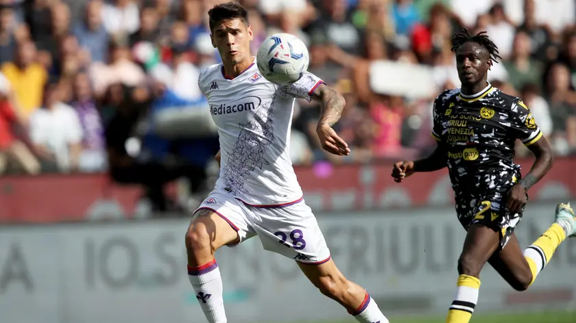 Fiorentina’s Lucas Martinez Quarta (L) on his way to score during the Italian Serie A soccer match Udinese Calcio vs ACF Fiorentina at the Friuli - Dacia Arena stadium in Udine, Italy, 24 September 2023. ANSA / GABRIELE MENIS