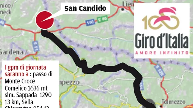Partenza da San Candido, il giorno dopo un momento clou della corsa rosa, il tappone dolomitico di Moena e non le Tre Cime di Lavaredo come si pensava. Da San Candido svolta a sinistra e prima asperità dei 191 km: Passo di Monte Croce Comelico. Da Sesto in Pusteria un riscaldamento per i corridori, così come l’agevole salita verso Cima Sappada dalla valle del Piave.