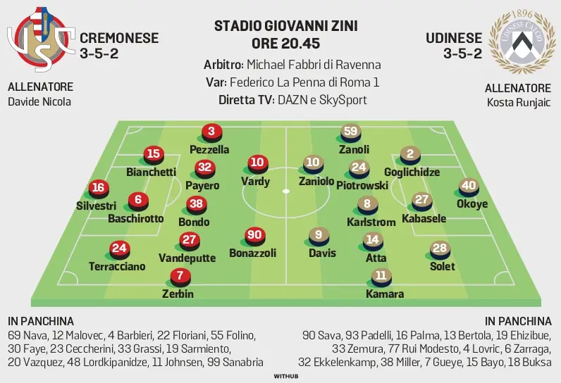 Atta, invece, partirà dalla mediana, affiancato da Karlstrom e Piotrowski (favorito su Lovric), mentre sulle fasce dovrebbe esserci posto per Zanoli e Kamara, che sembrano aver vinto il ballottaggio con Ehizibue e Zemura. In difesa stasera mancherà ancora Kristensen che sarà sostituito come contro il Cagliari da Kabasele, perno centrale del reparto in panchina, con Goglichidze e Solet ai fianchi sull’ultima linea a protezione della porta dove, dopo la squalifica, tornerà Okoye.