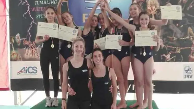 cividale. Ha fatto incetta di tricolori la società cooperativa sociale Santa Angela Merici di Cividale che, nei giorni scorsi, è rientrata dai campionati italiani di Teamgym di Cesenatico con un considerevole bottino. Disciplina ginnica proveniente dalla Scandinavia ma sempre più diffusa in Europa e negli Stati Uniti, il Teamgym fa parte della Fisac (Federazione italiana sport acrobatici e coreografici) e prevede competizioni individuali e a squadre (da 6 a 10 partecipanti) su tre specialità: corpo libero, power tumbing e mini trampolino elastico. Volteggi e coreografie sono infatti gli elementi che rendono spettacolare questo sport.