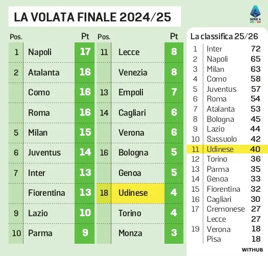 Chiamatela seconda chance. Una sorta di “Giorno della marmotta”, con Kosta Runjaic al posto dell’inarrivabile Bill Murray costretto nel film a rivivere lo stesso giorno all’infinito, cercando quindi di imparare dagli errori commessi la volta precedente, di evitare le trappole inattese perché si sa che possono essere nascoste dietro i dettagli più banali. Proprio così, il tecnico tedesco si ritrova con 40 punti in tasca come accadde dodici mesi fa dopo la 31ª giornata del 2024-’25 e adesso dovrà chiudere guidando l’Udinese nelle ultime sette giornate con un ritmo superiore, visto che raccolse solo 4 punti, poco più di mezzo a partita, una media da retrocessione, tanto che, in quella graduatoria parziale, finì davanti al solo Monza, precipitato a fine torneo in Serie B.