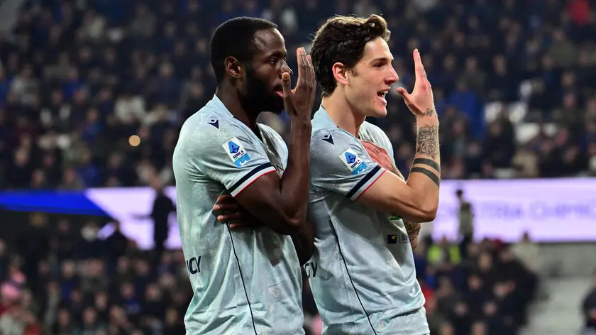 Zaniolo festeggia con Davis il gol del momentaneo 2-0 a Bergamo (ftoo Ansa)