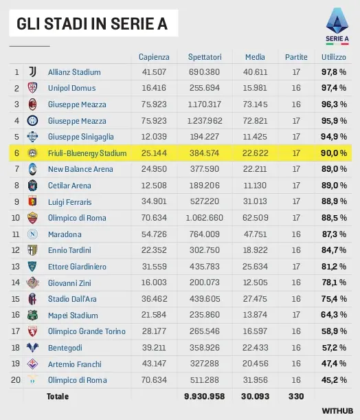 «La gente come noi non molla mai», cantavano una volta gli appassionati negli stadi, compreso nel vecchio Friuli, quello con ancora scoperto, scomodo e con la pista. Figuratevi adesso che nella versione Bluenergy Stadium l’impianto dei Rizzi è uno di quelli più godibili in Italia. E le cifre sull’affluenza in Serie A confermano che i tifosi dell’Udinese non hanno mai abbandonato la Zebretta: il 90% di riempimento su una capienza massima 25.144 spettatori è un dato che pone il club bianconero tra i primi posti, esattamente al sesto dopo la “capolista” Juventus, dopo i numero di San Siro sponda Inter e Milan e quelli di due impianti al limite minimo della capienza (sorvolando sulla precarietà) quello di Cagliari e quello di Como.