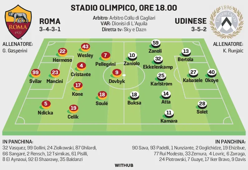 È un esame di continuità quello che attende l’Udinese, nel tardo pomeriggio di domenica 9 novembre, all’Olimpico contro la Roma. Dopo la miglior prestazione della stagione confezionata otto giorni fa contro l’Atalanta (secondo noi superiore anche a quella della seconda giornata con l’Inter) la squadra di Kosta Runjaic cerca conferme con quella che può considerarsi la sorpresa dell’altissima classifica. Diciamo la verità: era impensabile a inizio campionato immaginare la Roma nel quartetto di testa ad appena una lunghezza dal primo posto. Eppure “Mago” Gasperini ci è riuscito pur avendo ancora una squadra che non risponde completamente ai suoi dettami.