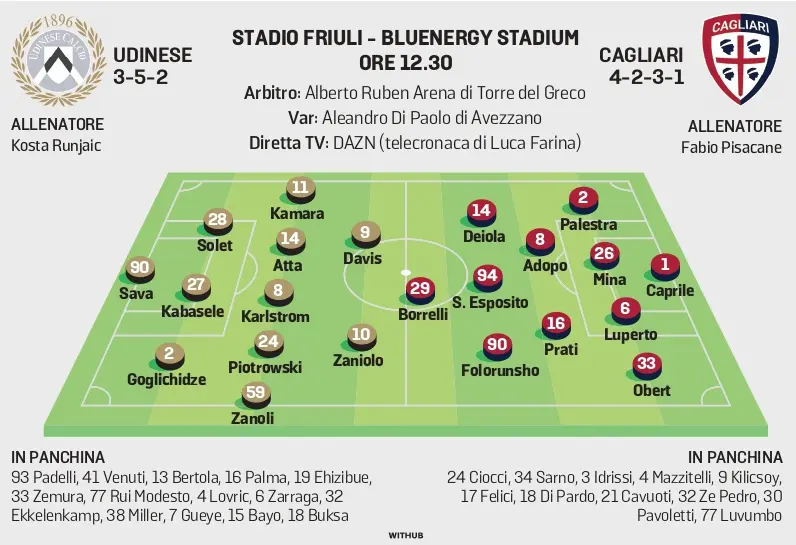 Con un successo l’Udinese si rimetterebbe in linea con i piani e spazzerebbe qualche dubbio sulla gestione di Runjaic che, tra Milan e Sassuolo, ha perso un po’ la rotta, tra deviazioni tattiche e poco coraggio nel proporre volti nuovi. Le difficoltà non mancano. Il Cagliari di Pisacane ha dimostrato di essere un complesso solido e affidabile, anche se ora ha perso per il resto della stagione Belotti, l’esperto centravanti vittima di un infortunio al ginocchio. Ma anche mister Kosta dovrà fare i conti con gli incidenti di percorso, visto che Kristensen sarà fuori dai giochi oggi per un problema muscolare.