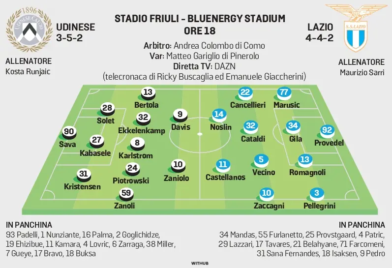 L’irrazionale porta a stringere un ferro di cavallo – un cornetto o altri ammennicoli, fate un po’ voi – dopo aver visto chi arbitrerà l’incontro stasera al Friuli - Bluenergy Stadium: il signor Andrea Colombo di Como con la collaborazione del collega Matteo Gariglio dalla sala Var di Lissone. Con Colombo l’Udinese non ha mai vinto: due sconfitte e un pareggio, ma proprio contro la Lazio.