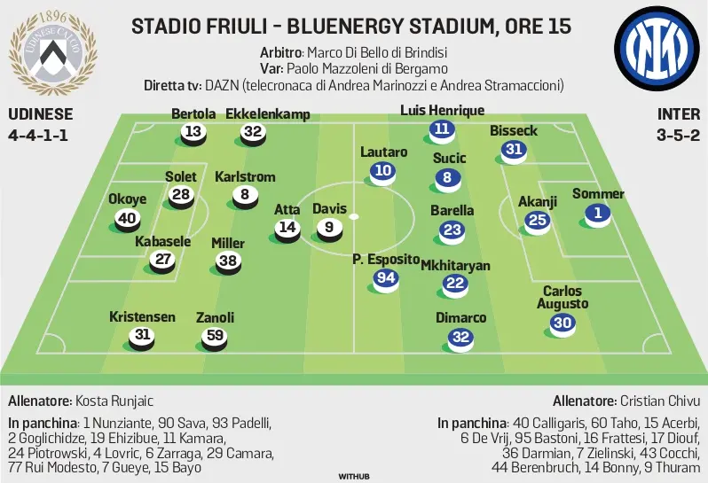 Quella del designatore Gianluca Rocchi si è orientata su un arbitro di esperienza. Ma Di Bello è una sorta di “gatto nero” per l’Udinese che ha incrociato per 22 volte il brindisino, perdendo ben 14 volte. Solo tre le vittorie. Ha già diretto questa sfida, tra l’altro, sia in Friuli, 0-2 nel 2020, sia a San Siro, 4-0 nel 2023, quando assegnò un rigore che fece discutere a Lautaro Martinez, toccato sulla spalla dal bianconero Perez.