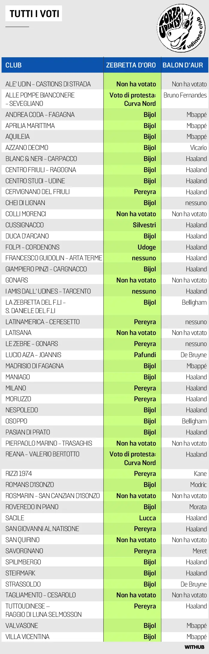 E il Balon d’aur? Il “pallone” offerto al miglior calciatore internazionale è finito nelle mani di Halaand, che, con la vittoria della Champions League 2022-’23, ha spazzato la concorrenza di Mbappé & co. Un voto a testa, qui, per i friulani Meret e Vicario.