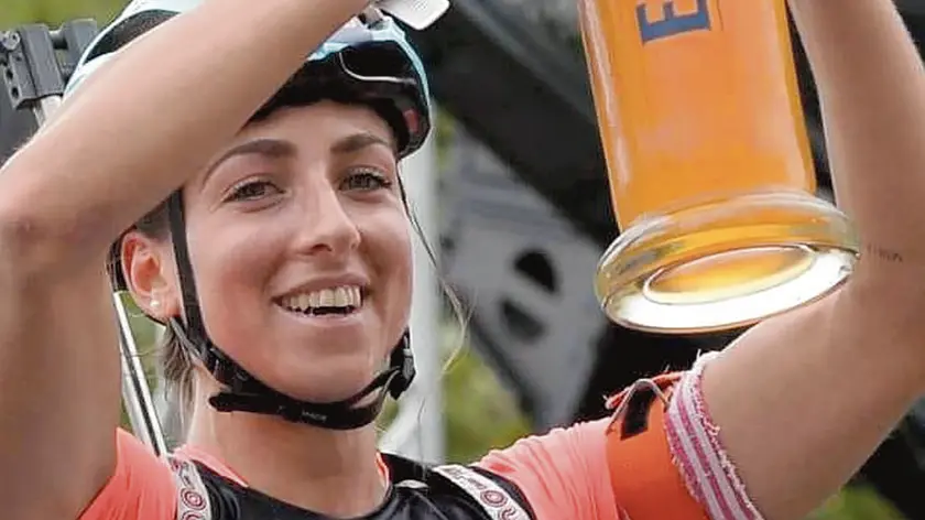 Lisa Vittozzi felice alla premiazione di una gara di biathlon estivo in Germania, con l’immancabile birra